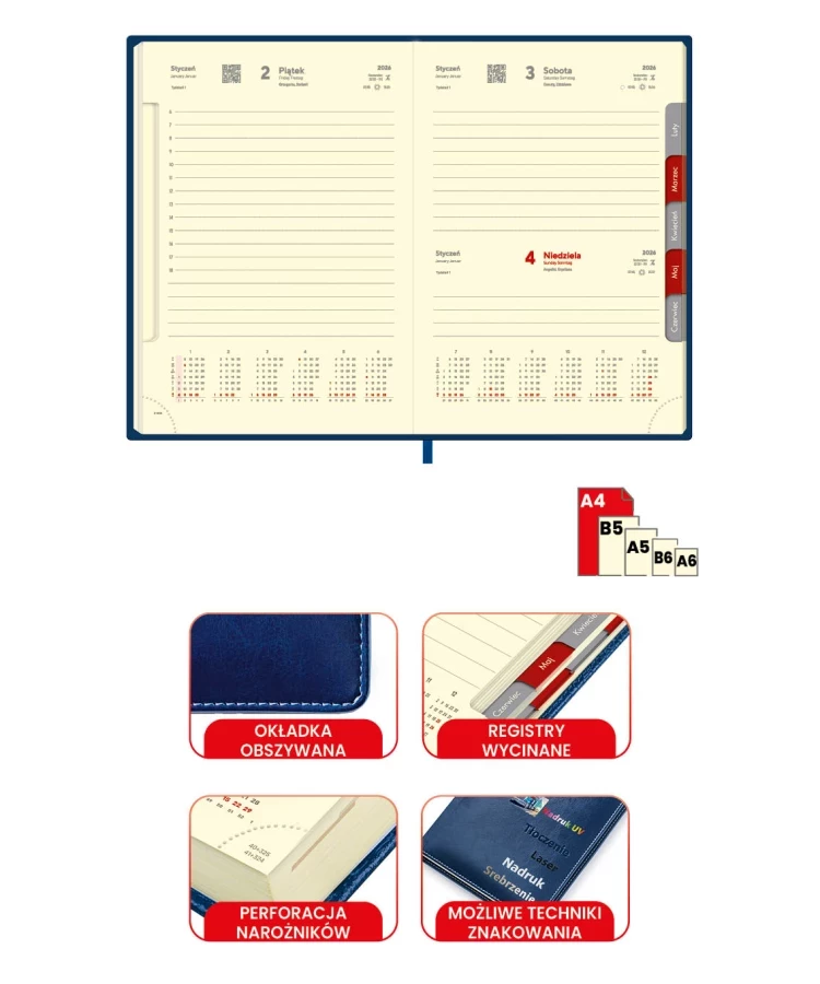 wycięte registry 2 rzędowe, perforacja narożników, zaokrąglone rogi, okładka z łączonej ekoskóry termoprzebarwialnej, obszyta, rok – tłoczony